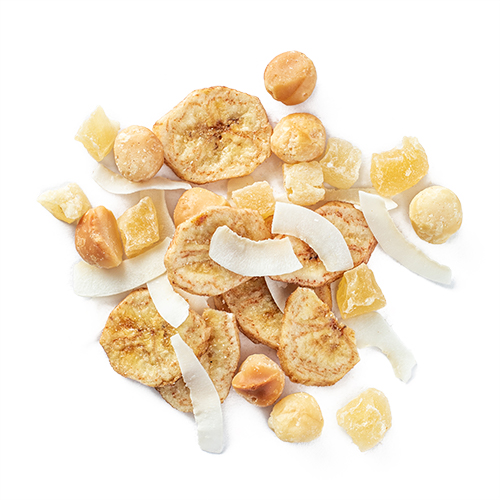 Banana chips (banana, coconut oil, sugar, banana flavour), pineapple (sugar, pineapple, citric acid)), dry roasted macadamia nuts, coconut ribbon